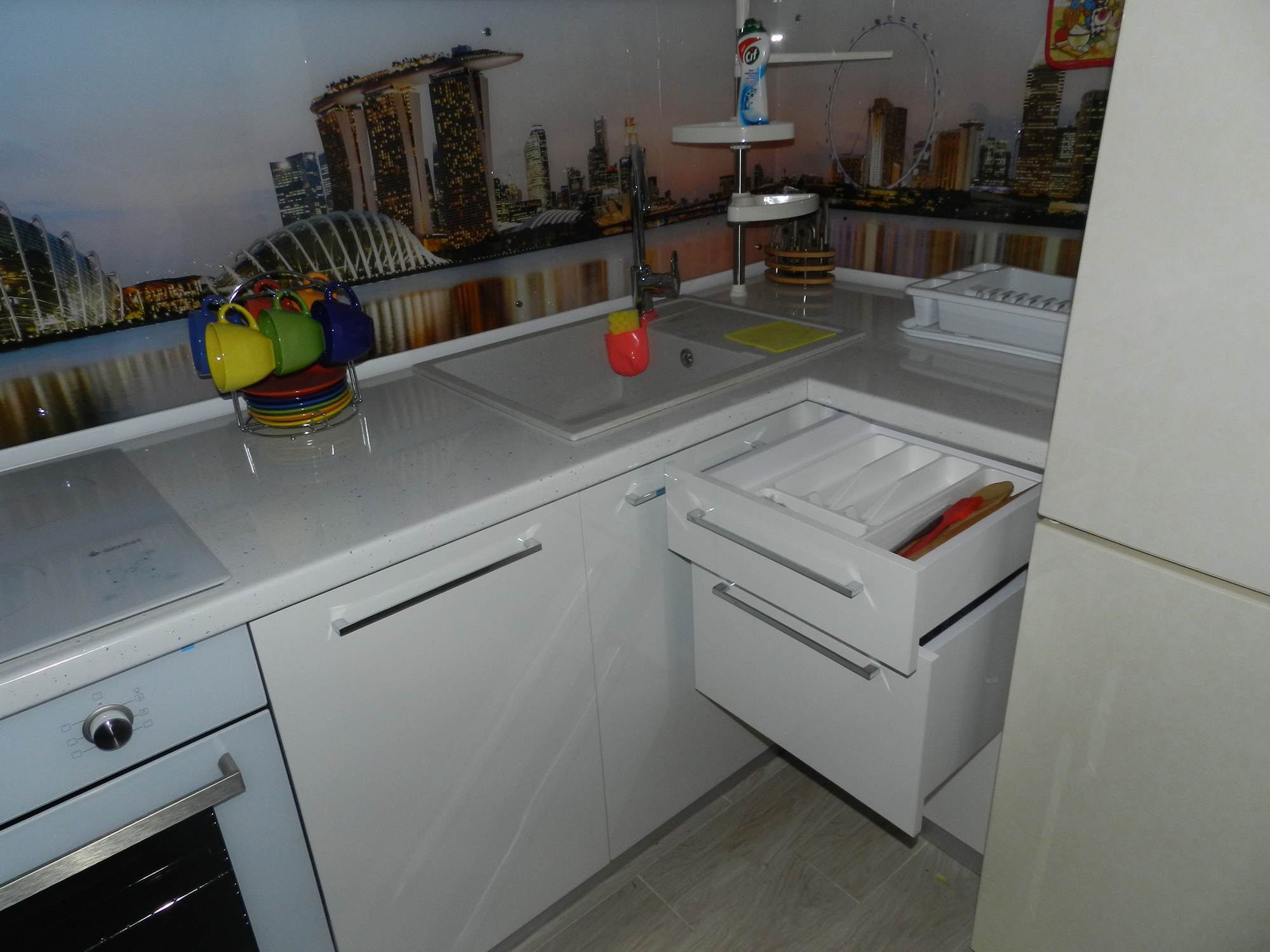 Стиль модерн, в котором созданы фасады кухни, придает кухонному гарнитуру оригинальность, а внутренняя конструкция позволит вместить все необходимое для каждой хозяйки. Большое число вместительных шкафчиков и выдвижных ящиков позволят, максимально качественно организовать пространство любой кухни, не важно расположена она в большом частном доме или малогабаритной квартире.