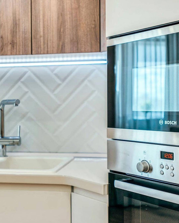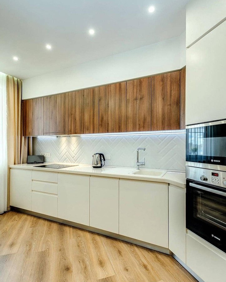 Нижние тумбы выполнены под слоновую кость удобны и вместительны. Материал фасада шпон, отлично смотрится, лёгкий в уходе, практичный. Столешница из белого кварца будет служить вам долгие годы.