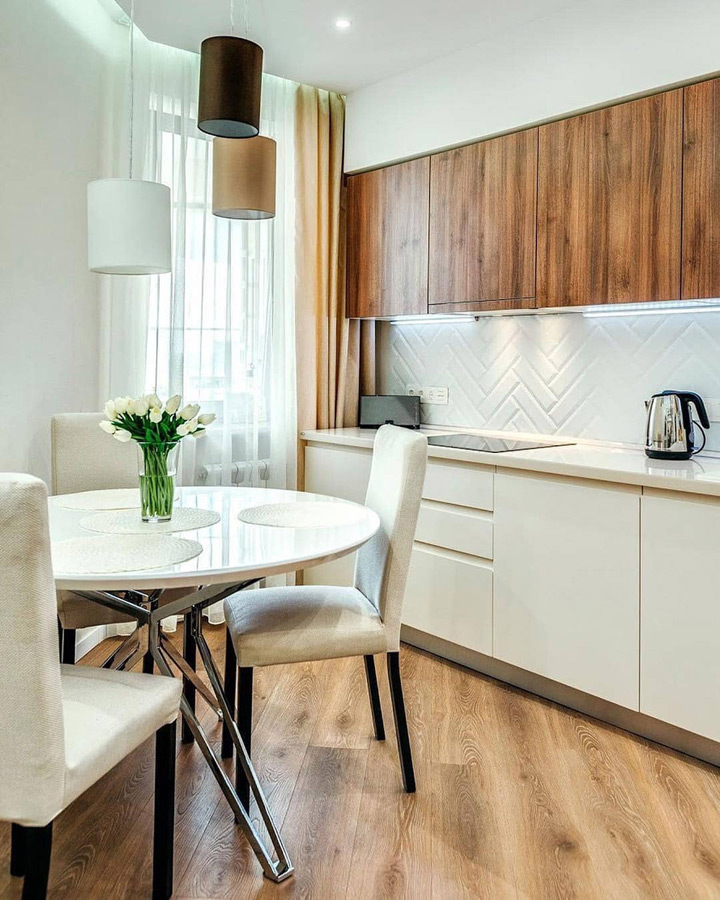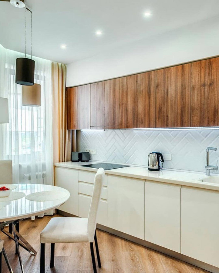 Навесные шкафы цвета орех сделаны без ручек, гараздо проще открывать за нижний край дверцы. Пространство между потолком и шкафчиками закрыто во избежании лишнего скопления пыли. Предусмотрена встроенная вытяжка и сушка для посуды.