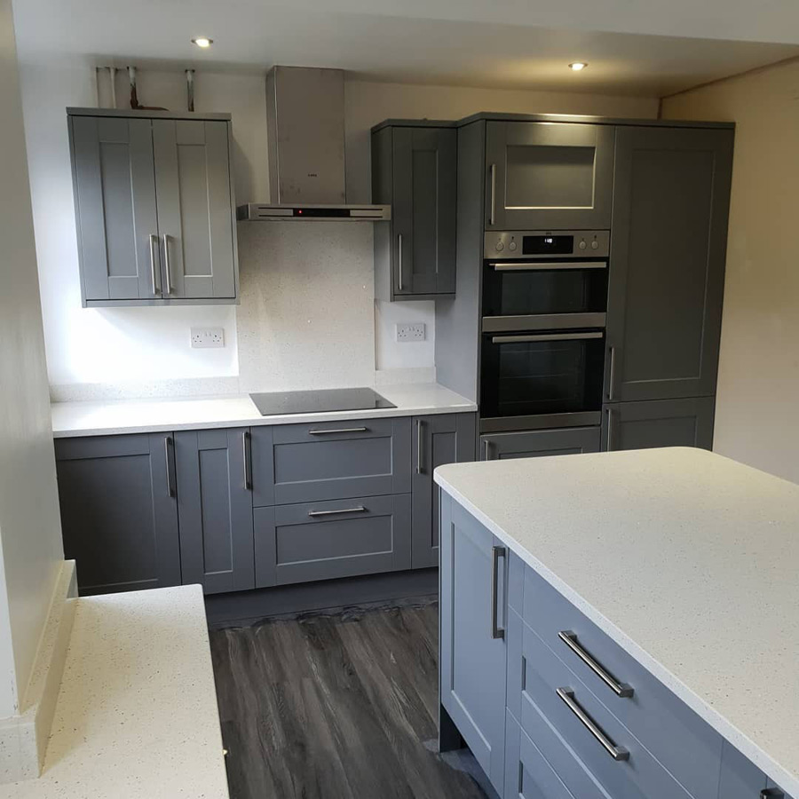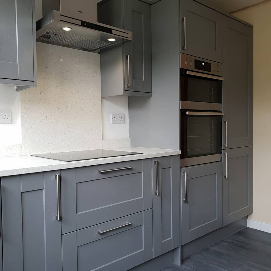 Все фасады выполнены в шпоне благородного серого цвета, что делает эту кухню универсальной на все времена, а высокое качество материалов позволит эксплуатировать ее столь долго, сколько этого захочет хозяйка.