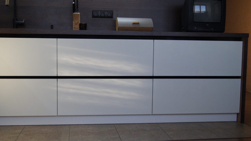 В итоге получили потрясающую кухню. Фасады очень приятного для глаза оттенка. Ручки крупные, удобные. Шикарная темная столешница, толстая, плотный плинтус. Фурнитура добротная, петли с доводчиками, дверки без скрипа закрываются. Ящики с импортными направляющими, тоже с доводчиками.